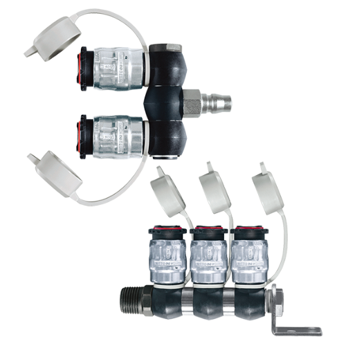 多個空氣出口可360°自由旋轉。低壓損、 大流量的Full-Blow快速接頭的集合配管型。